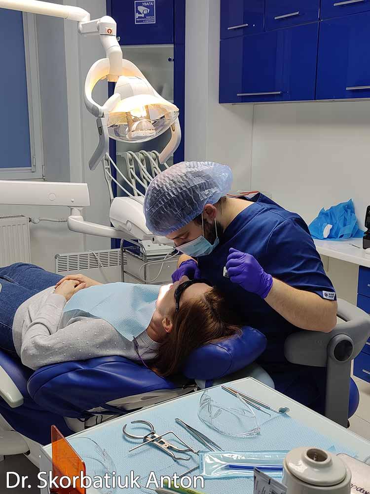 Therapist in the network of dental clinics «Lumi-Dent» in Kiev, conducts an appointment at the department in Obolon' district.