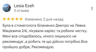 Це найкраща стоматологиня, яка в мене коли-небудь була. Процедура пройшла абсолютно безболісно, дуже акуратно і професійно. Дар’я має легку руку та створює відчуття спокою навіть під час складних процедур, що дуже заспокоює.