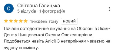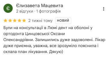 Були на консультації в Люмі дент на оболоні у ортодонта Цинцовської Оксани Олександрівни. Залишились дуже задоволені. Лікар дуже приємна, уважна, все зрозуміло пояснила і склала план лікування. Дякую)