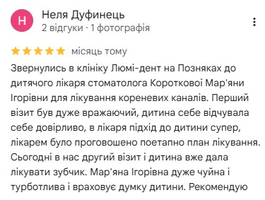 Звернулись в клініку Люмі-дент на Позняках до дитячого лікаря стоматолога Короткової Мар'яни Ігорівни для лікування кореневих каналів. Перший візит був дуже вражаючий, дитина себе відчувала себе довірливо, в лікаря підхід до дитини супер, лікарем було проговошено поетапно план лікування. Сьогодні в нас другий візит і дитина вже дала лікувати зубчик. Мар'яна Ігорівна дуже чуйна і турботлива і враховує думку дитини. Рекомендую