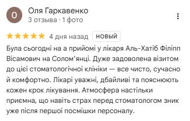 Була сьогодні на а прийомі у лікаря Аль-Хатіб Філіпп Вісамович на Соломʼянці. Дуже задоволена візитом до цієї стоматологічної клініки — все чисто, сучасно й комфортно. Лікарі уважні, дбайливі та пояснюють кожен крок лікування. Атмосфера настільки приємна, що навіть страх перед стоматологом зник уже після першої посмішки персоналу.