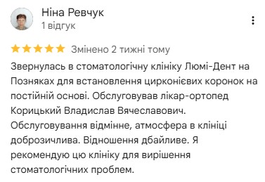 Звернулась в стоматологічну клініку Люмі-Дент на Позняках для встановлення цирконієвих коронок на постійній основі. Обслуговував лікар-ортопед Корицький Владислав Вячеславович. Обслуговування відмінне, атмосфера в клініці доброзичлива. Відношення дбайливе. Я рекомендую цю клініку для вирішення стоматологічних проблем.