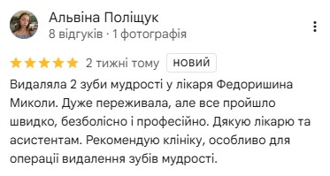 Видаляла 2 зуби мудрості у лікаря Федоришина Миколи. Дуже переживала, але все пройшло швидко, безболісно і професійно. Дякую лікарю та асистентам. Рекомендую клініку, особливо для операції видалення зубів мудрості.