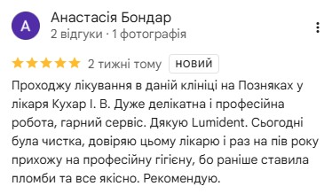 Проходжу лікування в даній клініці на Позняках у лікаря Кухар І. В. Дуже делікатна і професійна робота, гарний сервіс. Дякую Lumident. Сьогодні була чистка, довіряю цьому лікарю і раз на пів року прихожу на професійну гігієну, бо раніше ставила пломби та все якісно. Рекомендую.